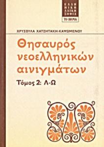 Ο "Θησαυρός νεοελληνικών αινιγμάτων" περιλαμβάνει 800 αινίγματα με τις παραλλαγές τους, δηλαδή ένα σύνολο περίπου 6.500 κειμένων τα οποία προέρχονται από διάφορα μέρη της Eλλάδας και άλλες ελληνόφωνες περιοχές. Στον δεύτερο αυτό τόμο αποθησαυρίζονται, σε αλφαβητική σειρά, τα αινίγματα των οποίων η απάντηση είναι λέξη που αρχίζει από τα γράμματα Λ έως Ω. Στον τόμο αυτό, ο αναγνώστης επίσης θα βρει: Βιβλιογραφία, στην οποία περιλαμβάνονται μελέτες σχετικά με το αίνιγμα, καθώς και οι πηγές από όπου αντλήθηκαν τα αινίγματα του δίτομου έργου. Πίνακες (α) των θεματικών ενοτήτων και (β) των τόπων προέλευσης των αινιγμάτων που περιλαμβάνονται στον Θησαυρό. Γλωσσάριο με την ερμηνεία των άγνωστων, "αινιγματικών" λέξεων και των δύο τόμων του βιβλίου.